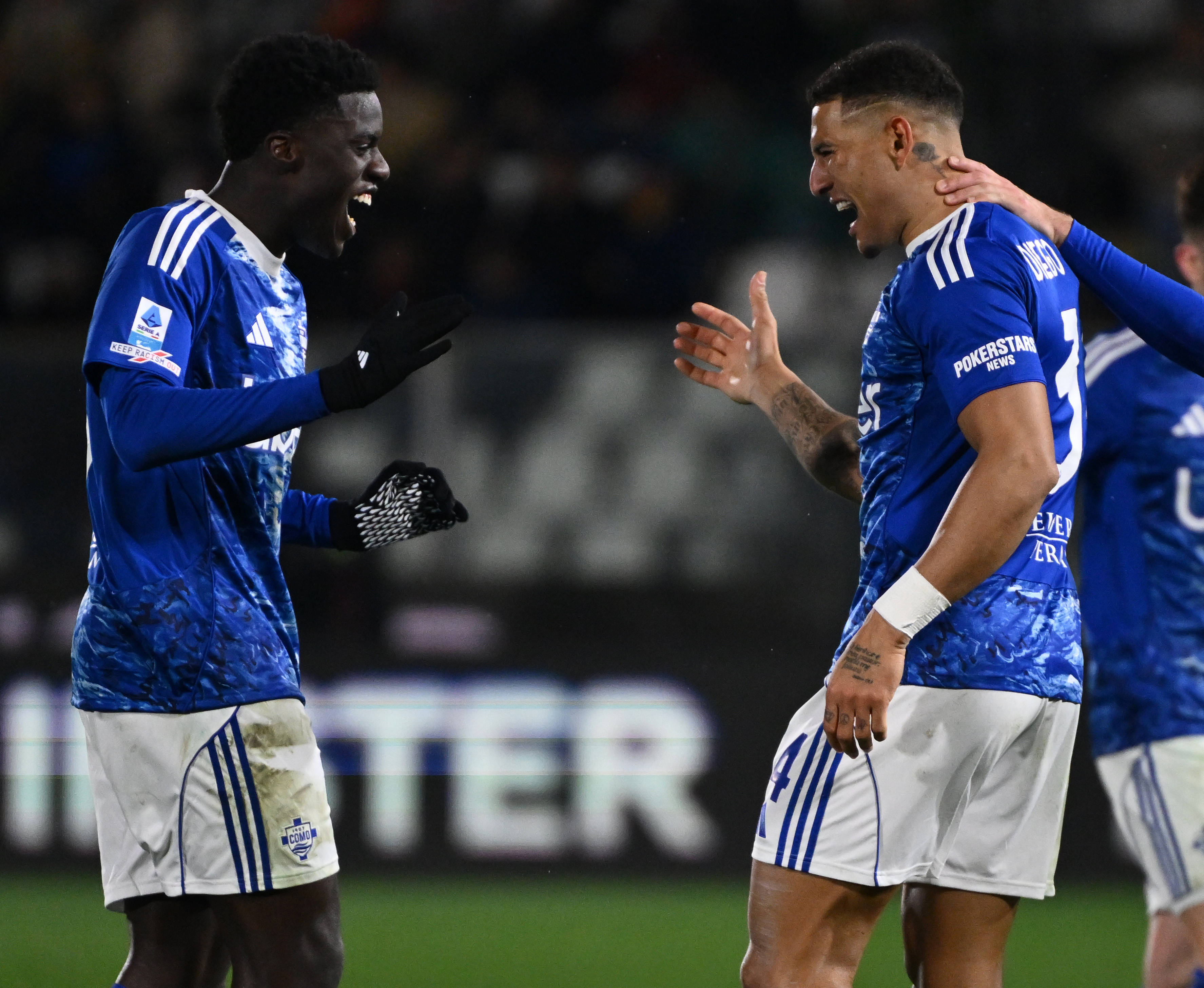 3月15日,科莫队球员杜维卡斯(左)与队友拉蒙庆祝进球。 新华社发